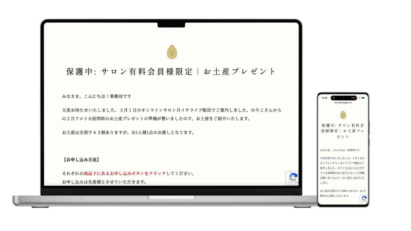 株式会社KILANA様が運営されているオンラインサロンにて、有料会員様向けの限定ページを整えたいとのご相談をいただきました。茂木の利子先生がアメリカ・セドナを訪れた際に購入されたお土産を、会員様へご案内するため、オンラインサロン内にパスワード付きの保護ページを設置。対象者のみが閲覧できる環境を整えたうえで、お好きな品を選んで申し込みいただける流れを構築しました。